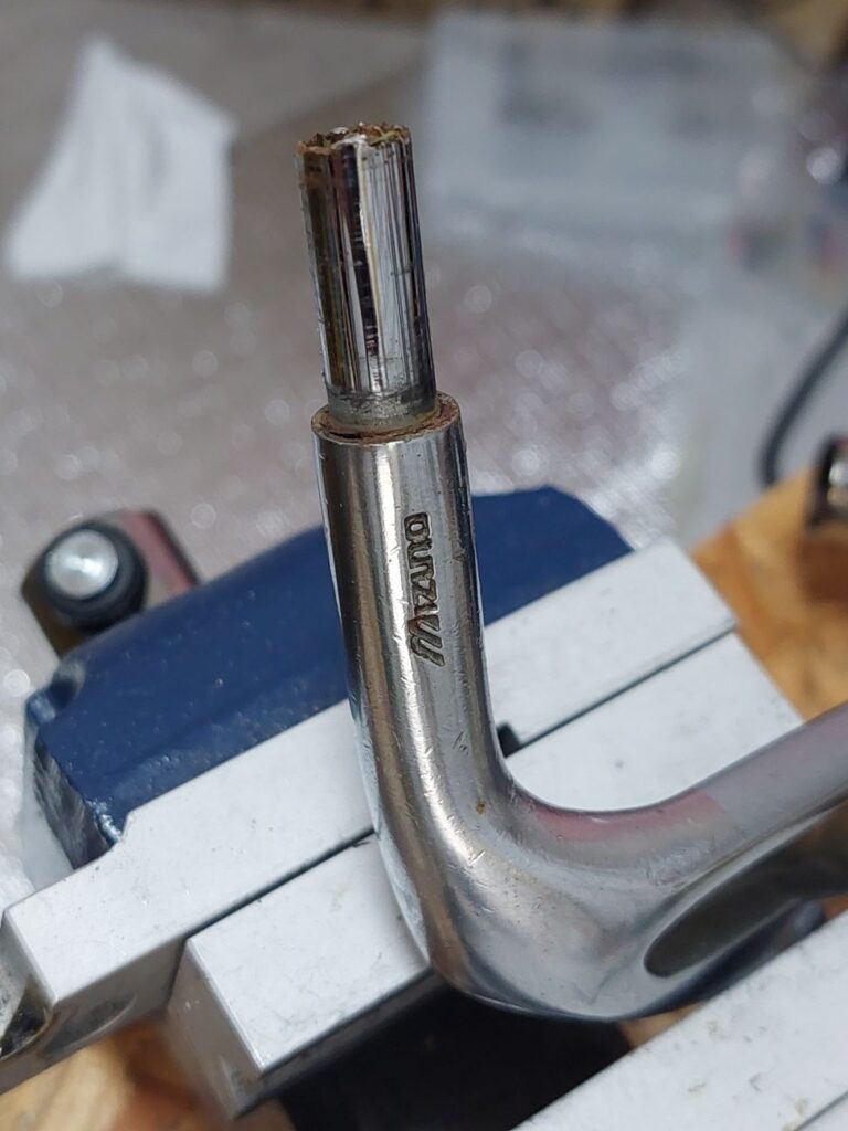 個人携帯の(080-2870-1996)をテルリン工房の専用電話にしました、その電話に安富さんから、連絡があって「スチールシャフトの根元から折れたので、修理してほしい!」で折れたシャフトを抜いて、シャフトを長さを合わせて、グリップを装着して修理を完成させました。ちなみに、自分は忘れていましたが・・・顧客データーをみて見ると、安富さん2年前にもアイアンの根元から折れて修理していました。