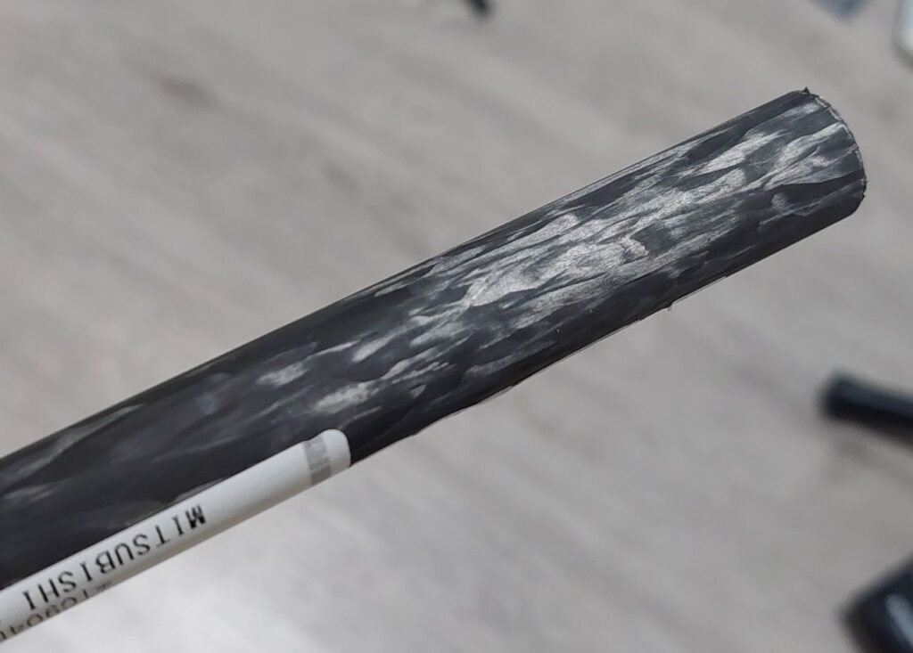 ちなみに普通はメーカー品名ロゴを後ろ差し(ロゴが見えないように裏にする、カーボンの継ぎ目とかもある?みたいなので)ですが、このOTironシャフトは普通のカーボンシャフトと違って、カーボン繊維の束に樹脂を沁み込ませた、製法なので、今までのカーボンシャフトより、均一に出来てるので、まったく裏表は関係ないので、テルリンが好きなロゴが上に見えるように組みます。