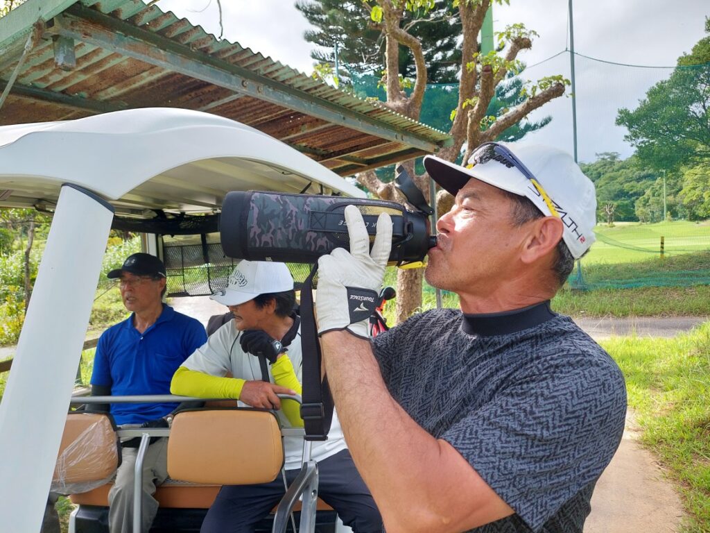 途中の、水を補充するところでは、コンペに参加してる人が、頭から水をかぶってる人や、大きな水筒に氷を一杯入れて飲んでないと、買ったコーラはすぐに、ホットに、もう自分も水筒を用意しないと・・・。スタートの1番ホール、ピンまで105ヤード、PWの距離ですが、カーボンに変えたので、かなり軽く打ちましたが、ピンに真っ直ぐ向かいましたがオーバー、アプローチがそのまま入って、バーディースタート。