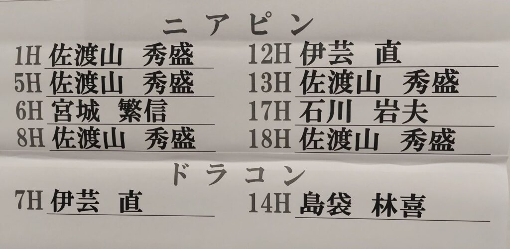 ニアピンホールが8つあって、テルリンはパーオンは1個のみ、この会の自分のライバルの佐渡山さんは、なんと!8打数5安打、5つもニアピンですこれは凄い!パチパチ!多分この福山コンペのベスト記録じゃないかな???自分も過去に3つ取ったことはありますが・・・。ちなみに、ドラコンは同組の伊芸さん、とテルリンがリシャフトしたドライバーを使ってる、島袋さんが取ってましたパチパチ!