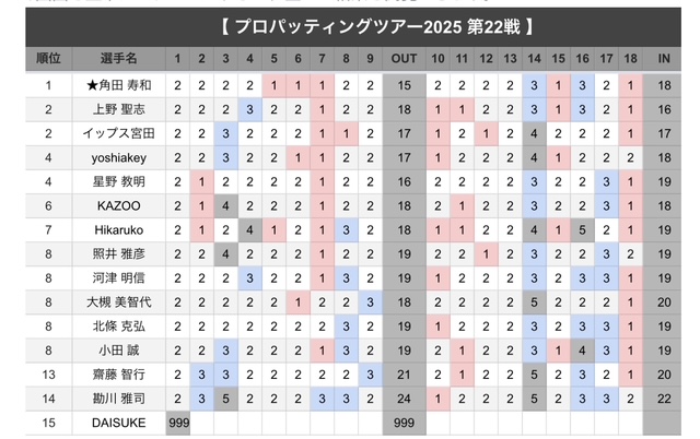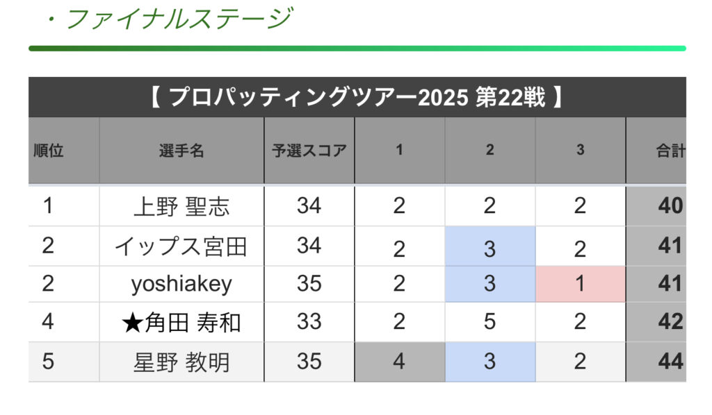 PS.22戦も、ファイナルステージに5人が出場、予選トップは角田プロの3アンダー、2位タイが上野プロとイップス宮田プロの2アンダー、4位タイでYOSHIAKEYプロと星野プロが1アンダー。なので、テルリンも1アンダーでファイナルに行けたのにーーー?残念無念!