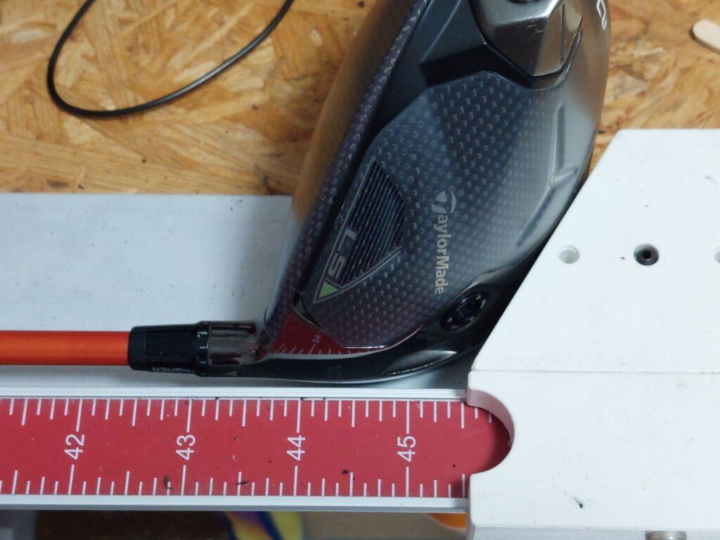 お客さんは、ドライバーからクレージーのシャフトを抜いて、シャフトにテーラーメードのスリーブを装着して、グリップにバックラインが入っているので、この向きにシャフトのスリーブを合わせてでした。で・・・携帯に連絡して、長さを相談「公式競技に出るなら0.25インチ長く、Qi35niに装着してあった45.5インチのツアーAD7Xより、1.5インチも長くなってシャフトも柔らかくなりますが・・・」