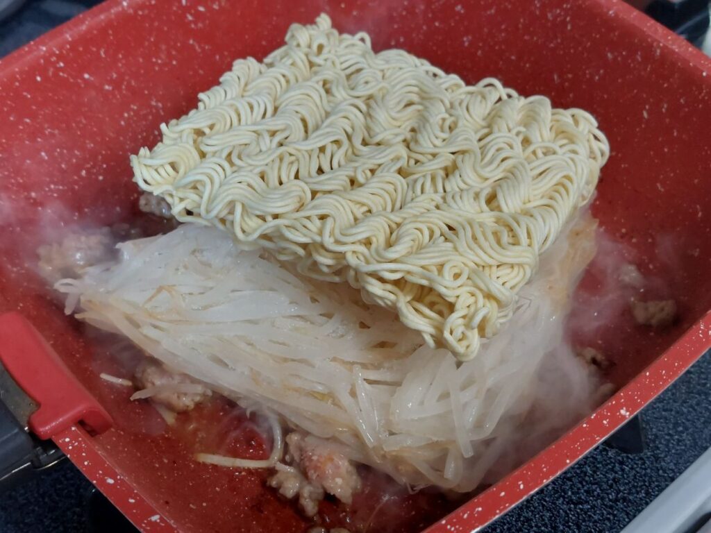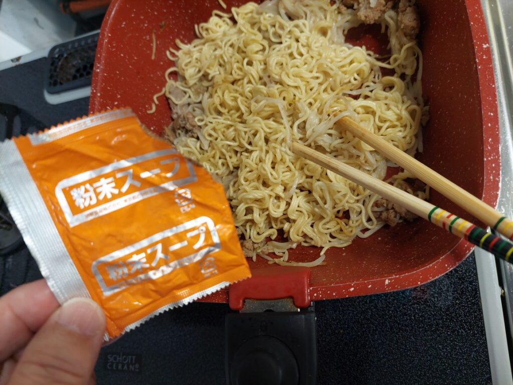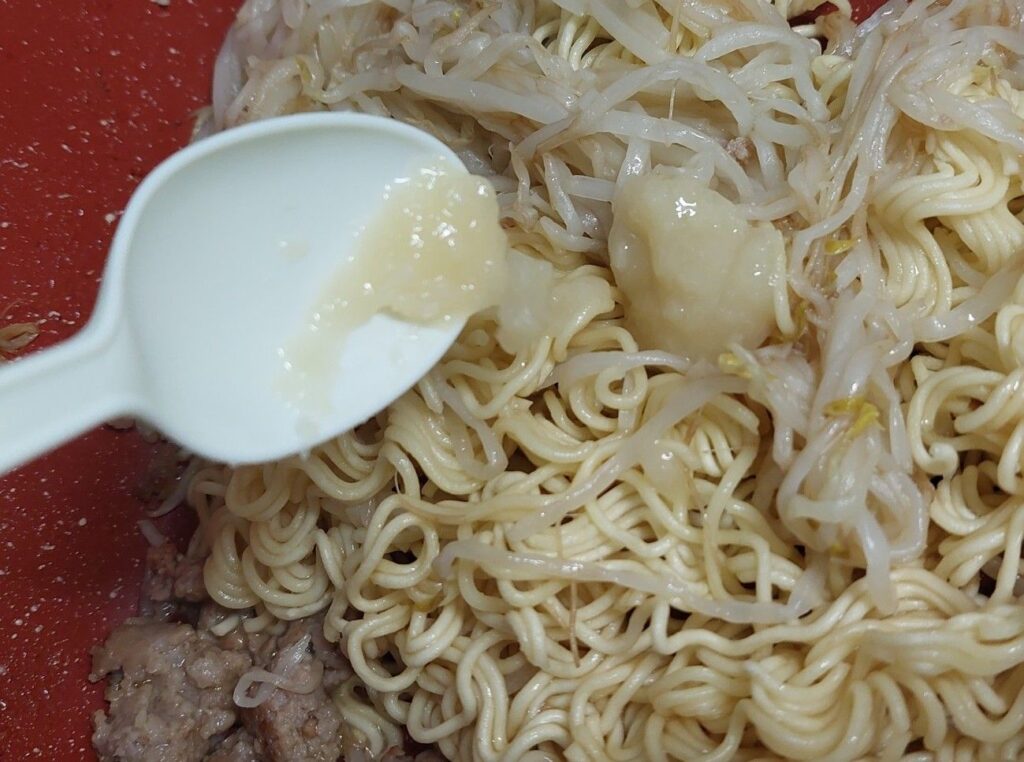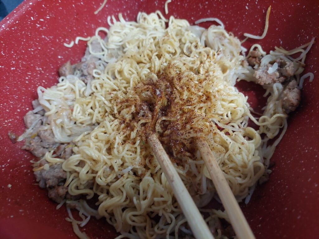 その上に乾麺を乗っけて、蓋をして、蒸すと、もやしの水分のみで良い感じにほぐれます。そこに、ペースト状のニンニクと袋麺に付いていた、粉末のスープの素を調整しながら入れて完成!簡単で美味しい焼きそばの出来上がり。次回は色合いを考えて長ネギでも入れようかな?