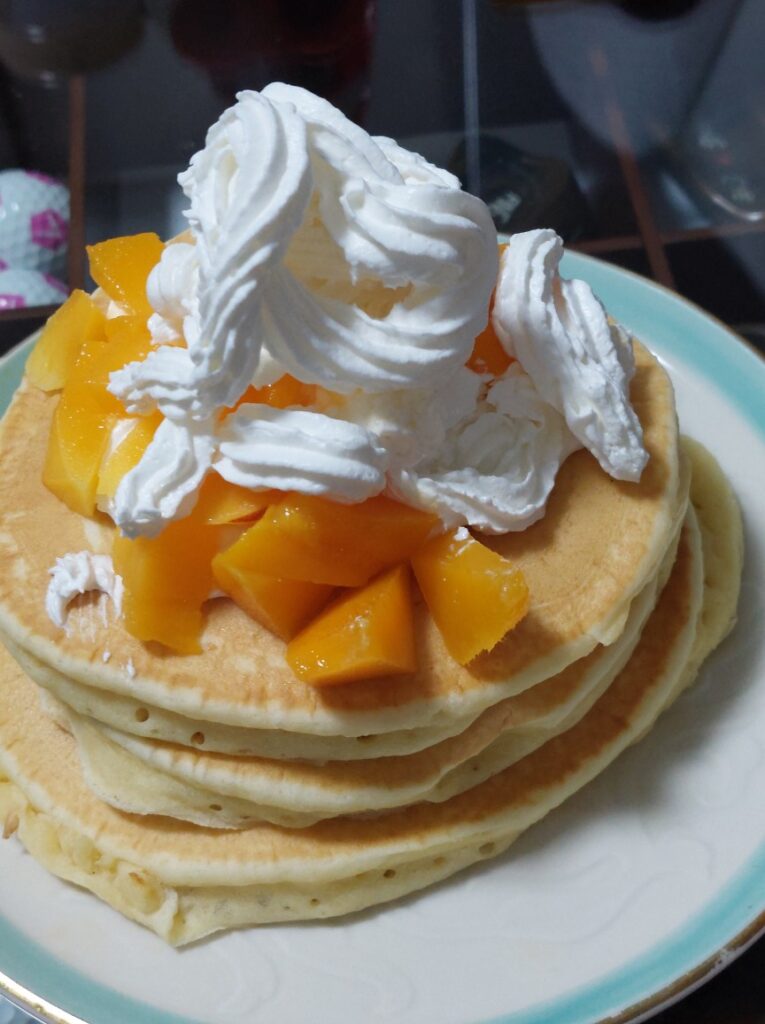 家に帰って来て、前に代行運転のバイトをしていた、「道」の社長からミニマンゴーをもらって、その時から計画していた、パンケーキを作りました!ホイップクリームとマンゴーをパンケーキ上にのせて完成です!