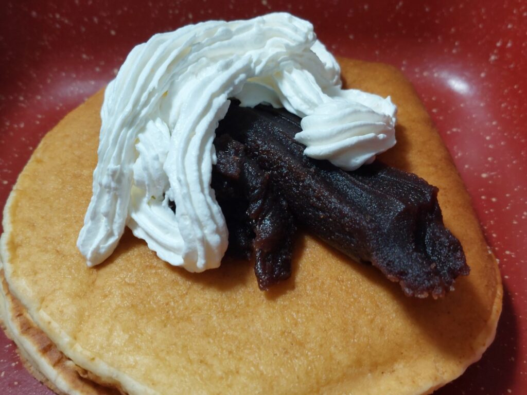PS2.特売で買ったホットケーキミックスを使って、大量に焼いたパンケーキを食事代わりに食べてます!一番初めは、貰ったミニマンゴーにホイップクリームを使って、マンゴーパンケーキ。次は、オーソドックスにバターとハチミツでホットケーキ、で22日の夜ご飯?はこし餡とホイップクリームのパンケーキを食べました。甘いモノ大好きなテルリンは超ー満足!美味し(うまし)!