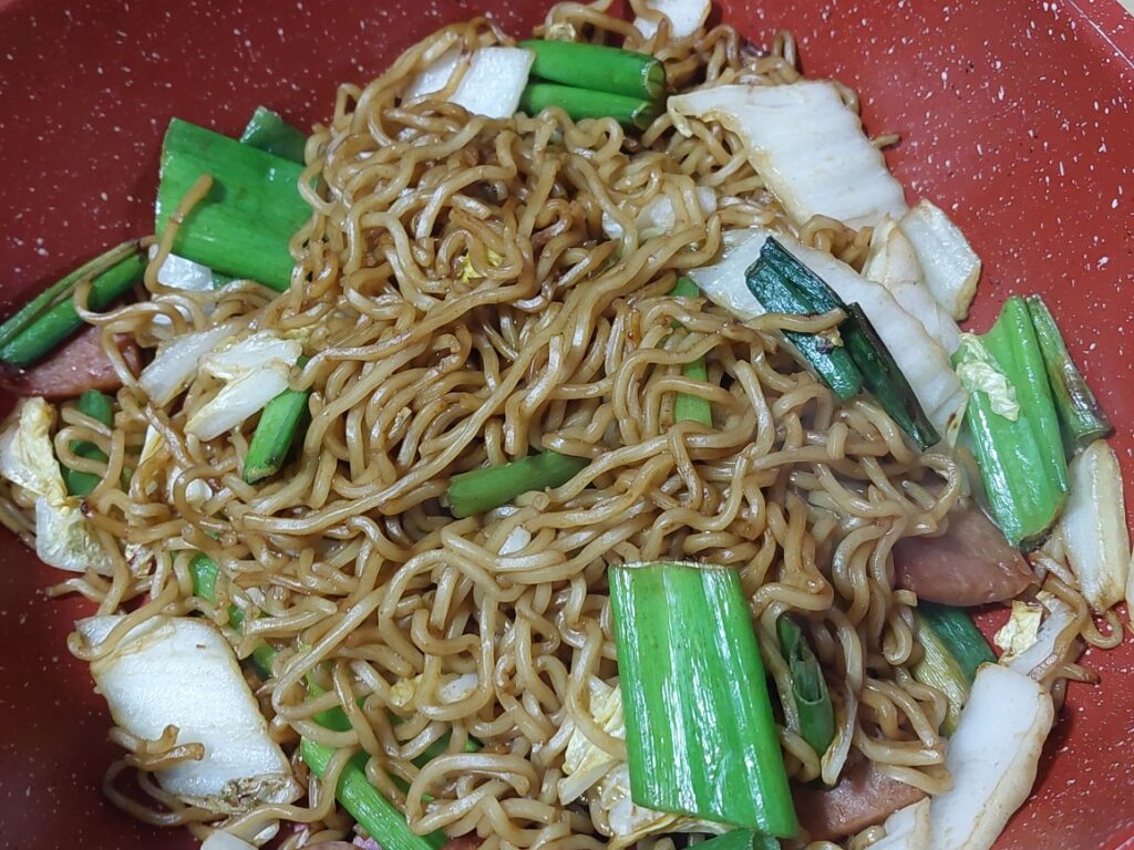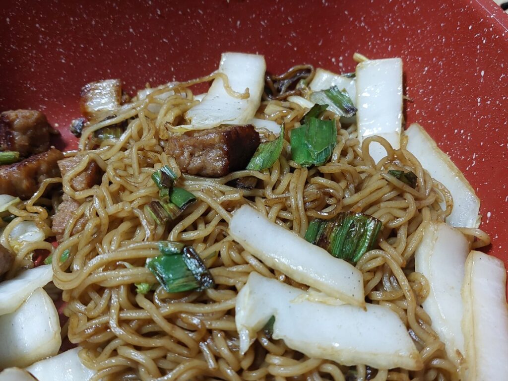 今回も、油をひかず、初めに入れた肉から出る油のみでテルリンレシピの焼きそばを作ります。麺は150グラム前後で量が少ない分、カサ増しで白菜とネギの緑の部分を一杯入れます(ネギの白い部分はテルリンレシピの納豆ゴハンに)。今回はソース焼きそばですが、隠し味?鳥ガラスープの素(粉末)を入れて、最後にソースで朝食の一回目完成!ネギが大きすぎた?ので夕食はネギを小さく切って2回目を作って食べました。次回はもう少し多き方が良かも?小さく切りすぎると、ネギ本来の甘みがあまり感じない?