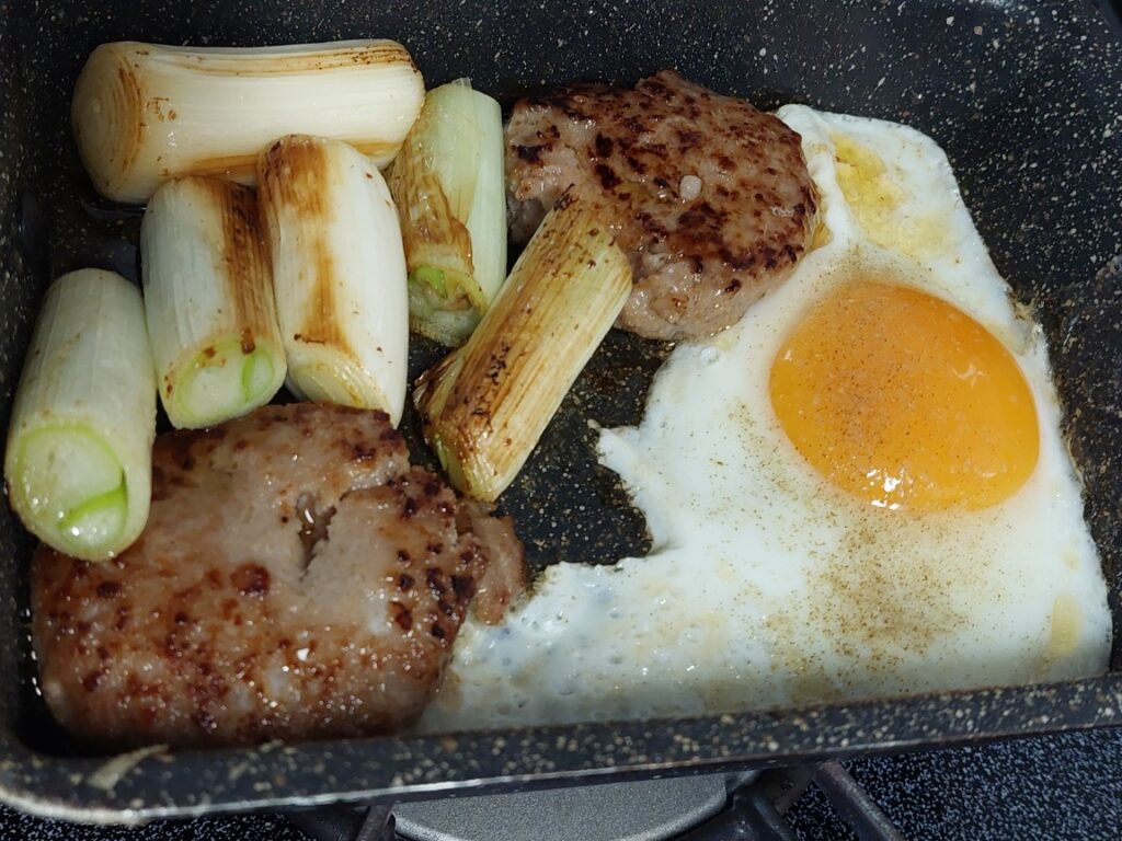 PS.冷蔵庫の食材、卵などは、ほぼ使い切り、その他のモノ食パン、野菜のざく切りは冷凍庫に入れてきました。最後の一個の卵を使って、テルリン・ワンプレートのオカズを作りました、ミニハンバーグと、ネギ炒めと半熟目玉焼きで完成!ご飯は、16穀米にテルリンレシピの納豆ご飯(ご飯にバター・納豆・かつお節・長ネギのみじん切り、醤油)。