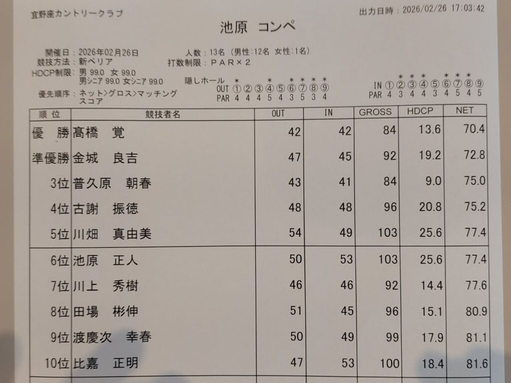 友達が21日に着いて、早速、(26日)北海道の初夏の様な最高の天気の中、宜野座カントリークラブに行って来ました!。相変わらず、腰がイタイイタイ病で、まともなゴルフには、なりませんでしたが・・・。今季1勝目です!ちなみに同伴者の高橋さんが!です!パチパチ!テルリンは優勝請負なので?同伴のメンバーが今年は何回優勝するだろう?ちなみに、自分は7勝で、同伴者は11勝でした。