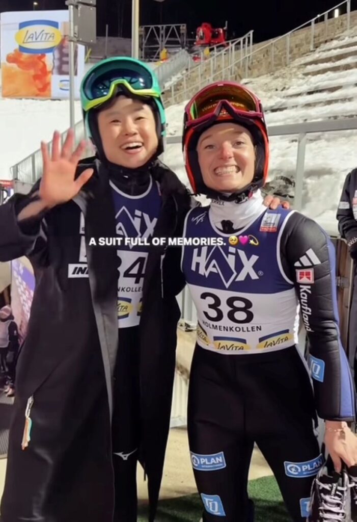 PS.今シーズンで引退のドイツのカタリナ・アウトハウス選手(18年平昌と22年北京のノーマルヒルの銀メダリスト)のスーツに寄せ書きする、伊藤有季選手。笑顔でポーズを取る、伊藤有季選手とカタリナ・アウトハウス選手。=伊藤有季のインスタグラムから=やっぱり、有希ちゃんは笑顔が似合う!