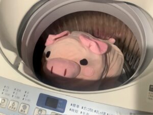 ピンブー(ピンクのブタの抱き枕)をお風呂に入れました。明日はシロプー(白のブタの抱き枕)