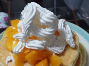 パンケーキを焼いて、貰ったミニマンゴーを使って、ホイップクリームをかけて完成です!