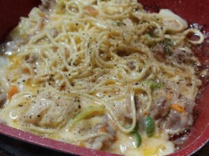チキンとネギを炒めて、ご飯と食べるつもりが、新しいテルリンレシピの焼きそばが出来ました!