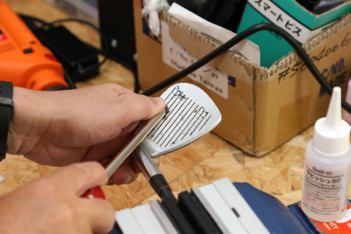クラブとシャフトの接着力を高めるため、接着する部分のメッキ、塗装を剥がす作業です。