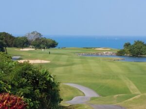 台風が過ぎて、3日は最高のコンディションでインからスタート、フルバックなので当初から鬼門のホールが3つあります!インに2つ、2番ホール235ヤードの林越えのショート、インの3番ホール谷越えで、アウトの4番ホール谷越えロン …